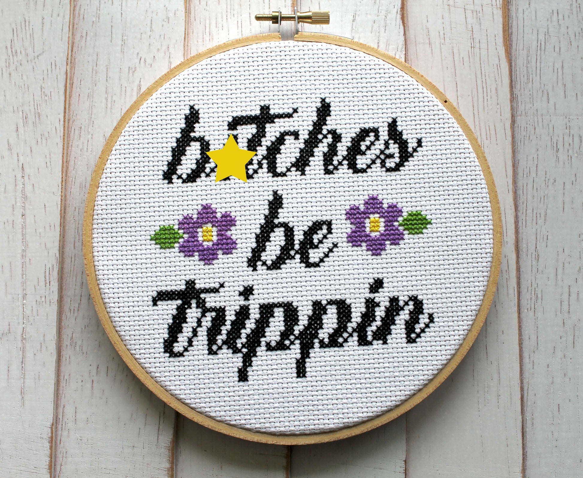 This DIY KIT is from our Floral + Foul counted cross stitch pattern collection and features "bitches be trippin" in cursive with floral elements on each side.