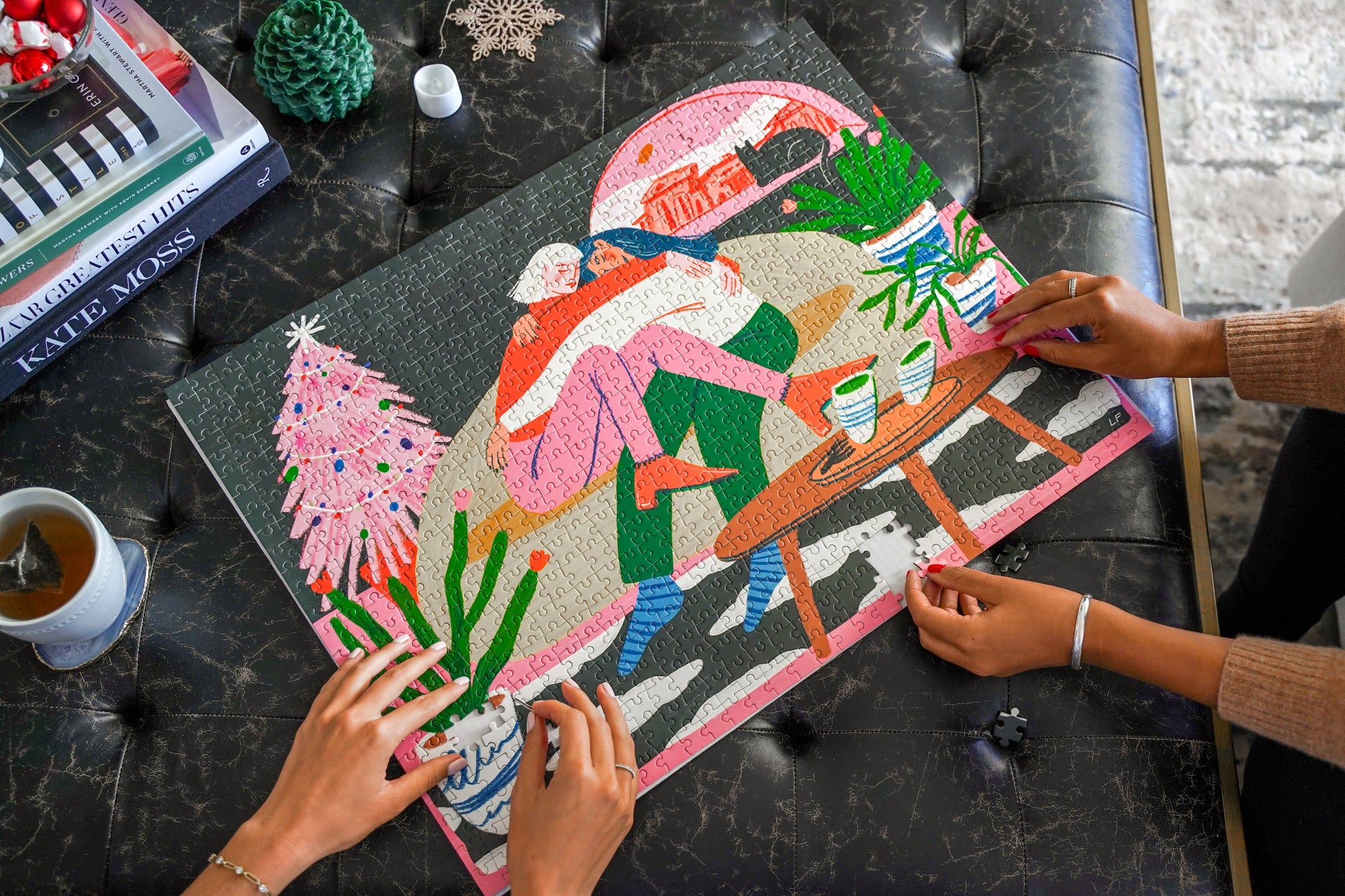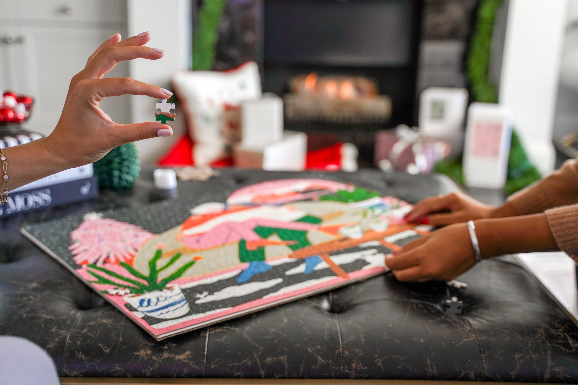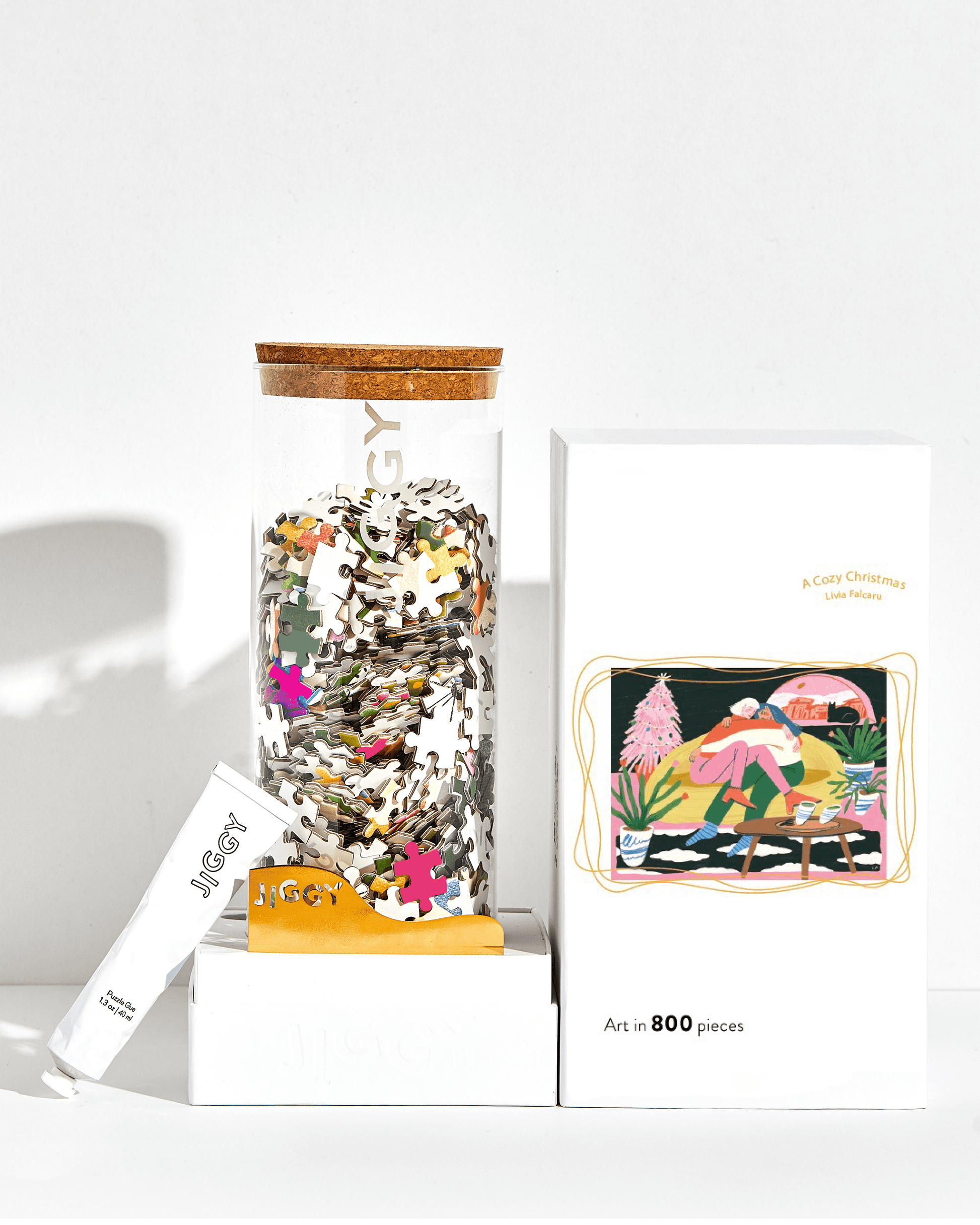 Each JIGGY puzzle comes in a reusable glass jar and includes a tube of puzzle glue, a straight-edge tool to spread the glue and a print of the art to follow.