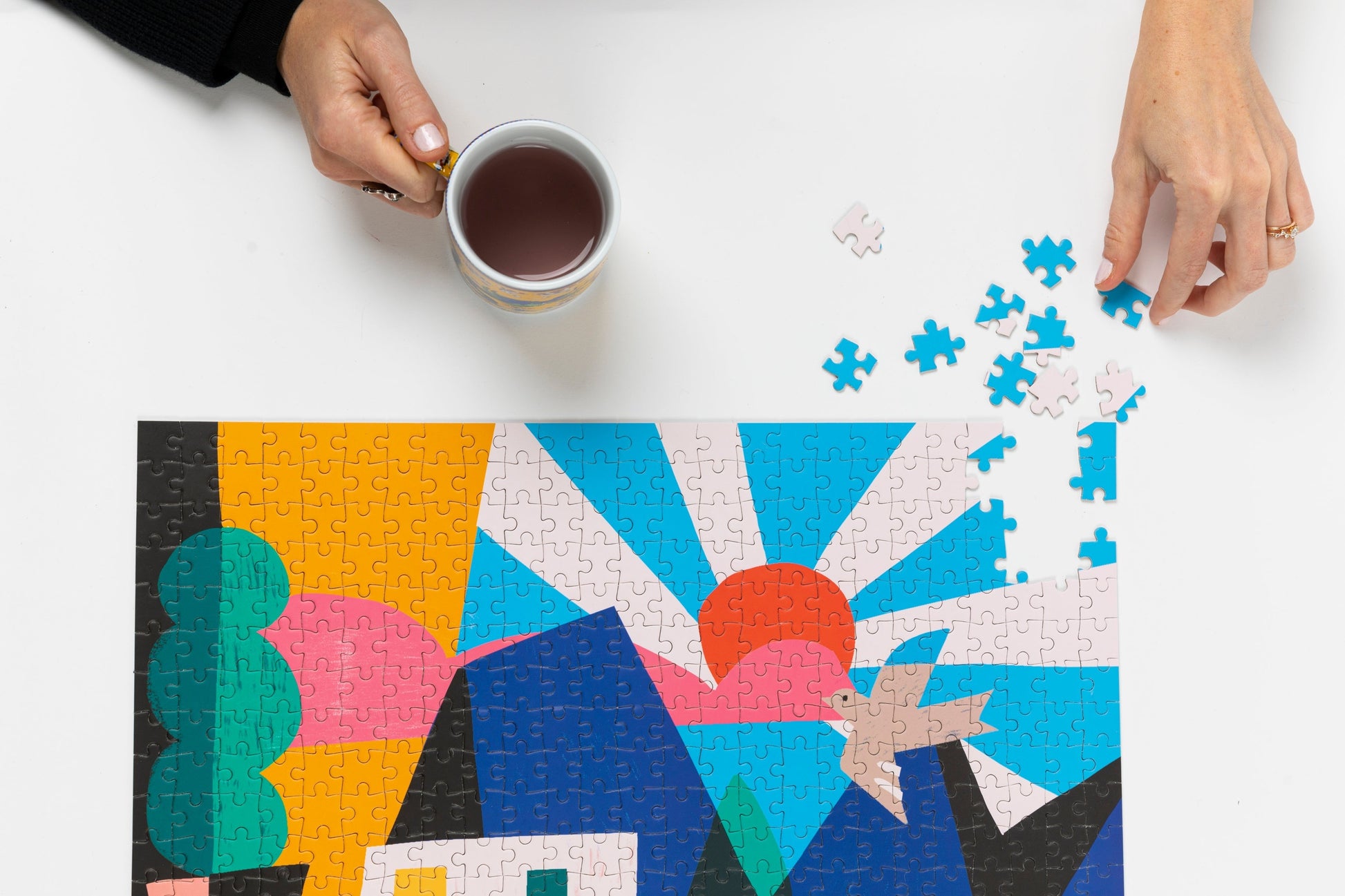 Each JIGGY puzzle comes in a reusable glass jar and includes a tube of puzzle glue, a straight-edge tool to spread the glue and a print of the art to follow