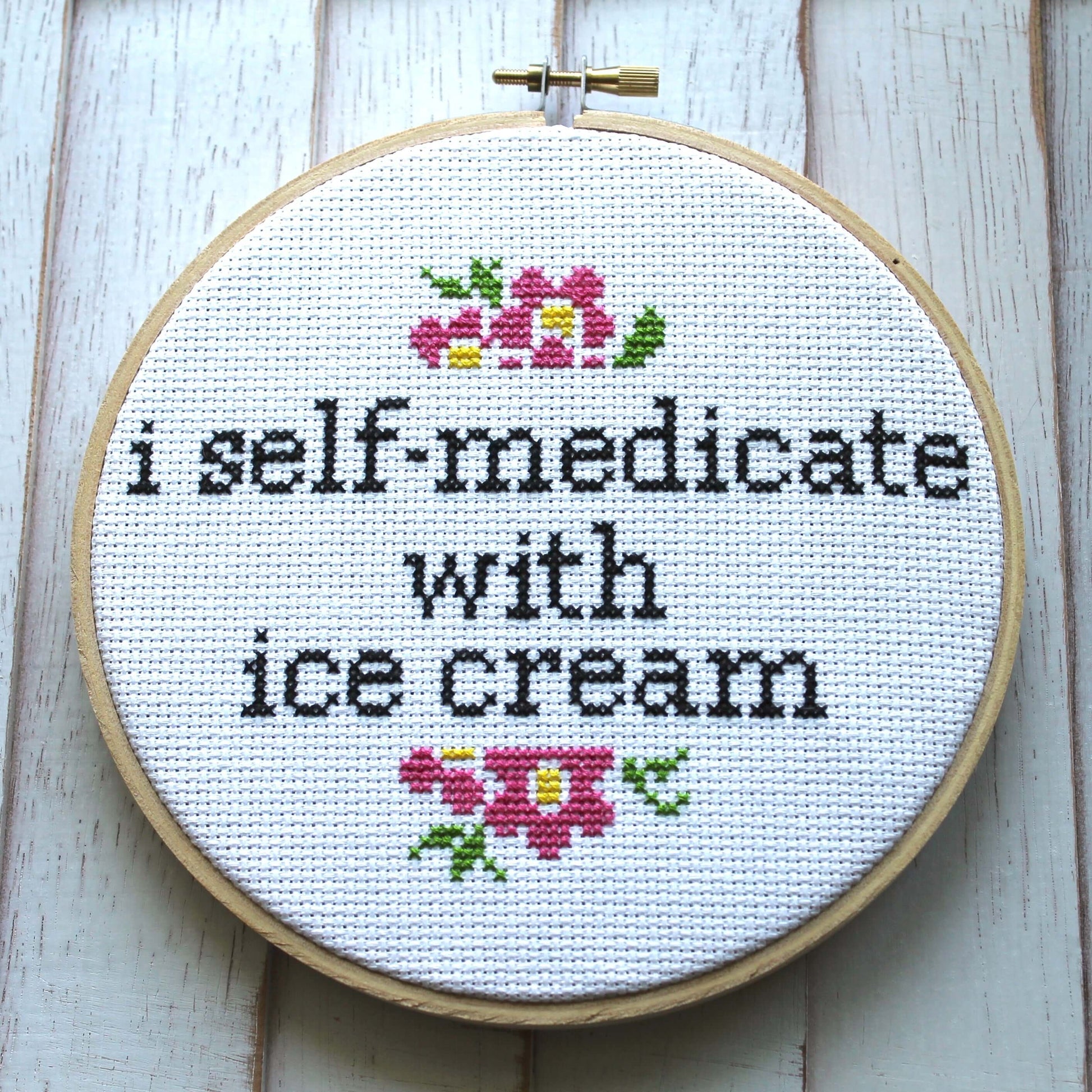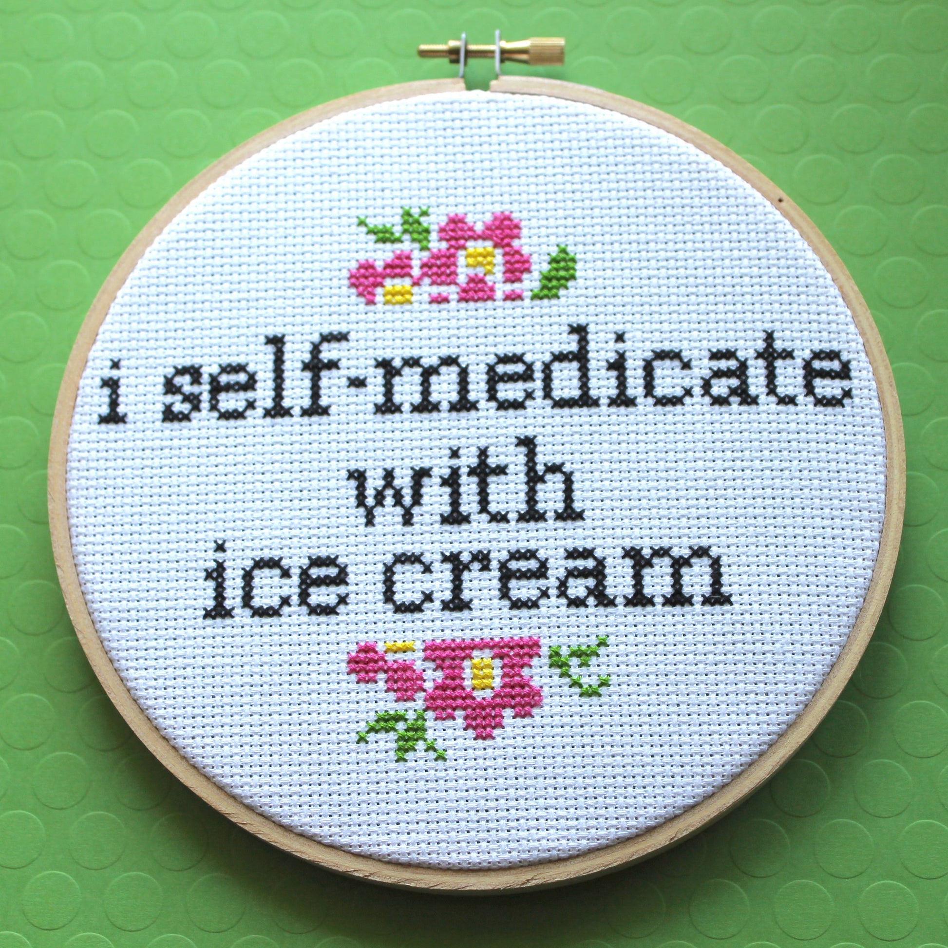 This DIY KIT is from our Floral + Foul counted cross stitch pattern collection and features "i self-medicate with ice cream'" in text with floral elements on top and bottom.