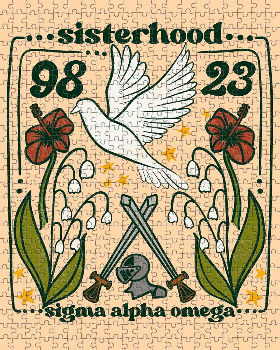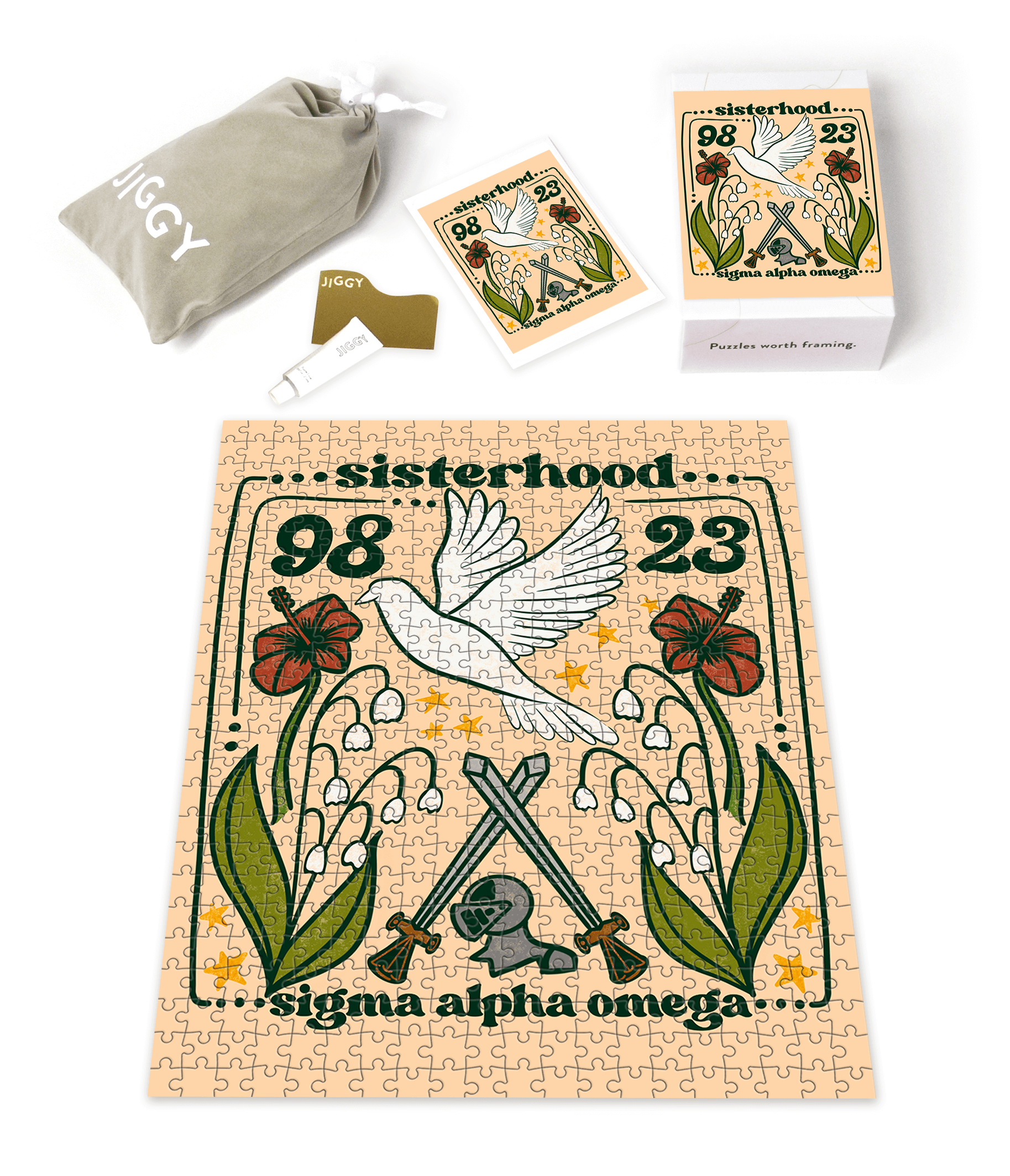 Each JIGGY x Sigma Alpha Omega puzzle comes in a reusable drawstring bag, box and includes puzzle glue to preserve your masterpiece.