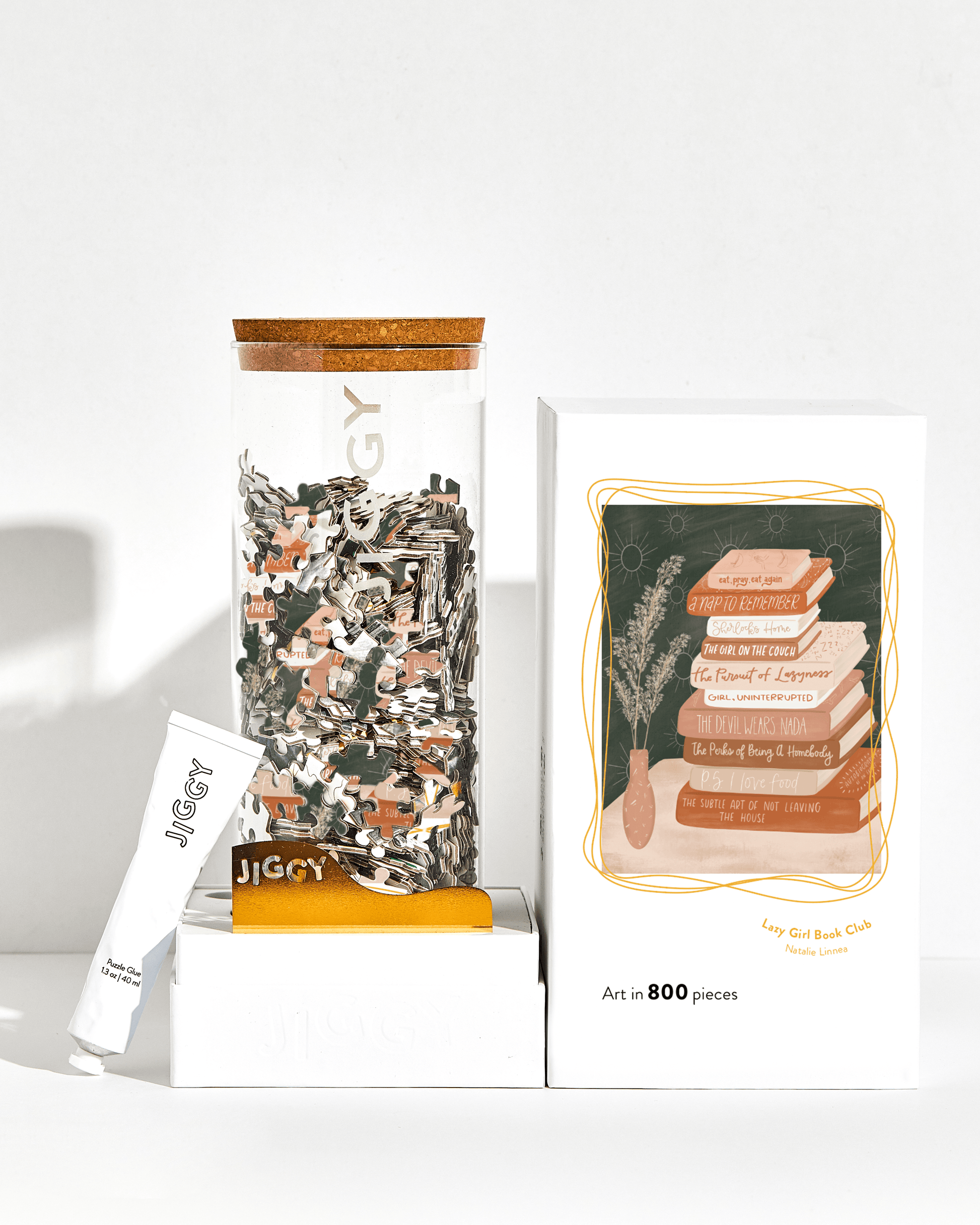 Each JIGGY puzzle comes in a reusable glass jar and includes a tube of puzzle glue, a straight-edge tool to spread the glue and a print of the art to follow.