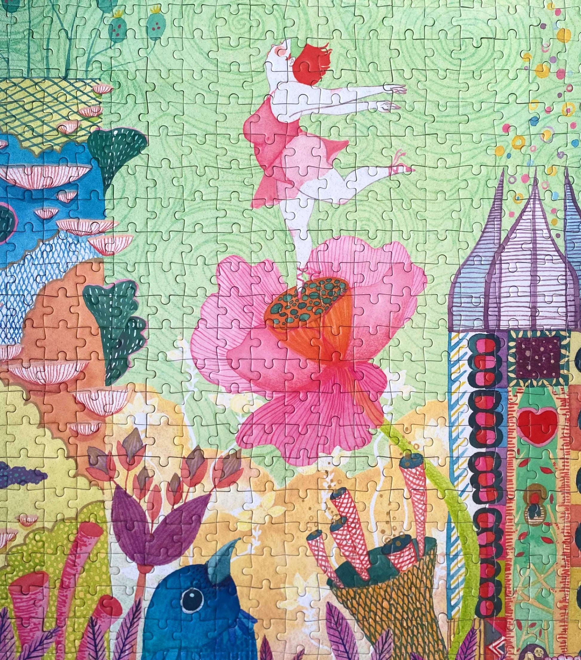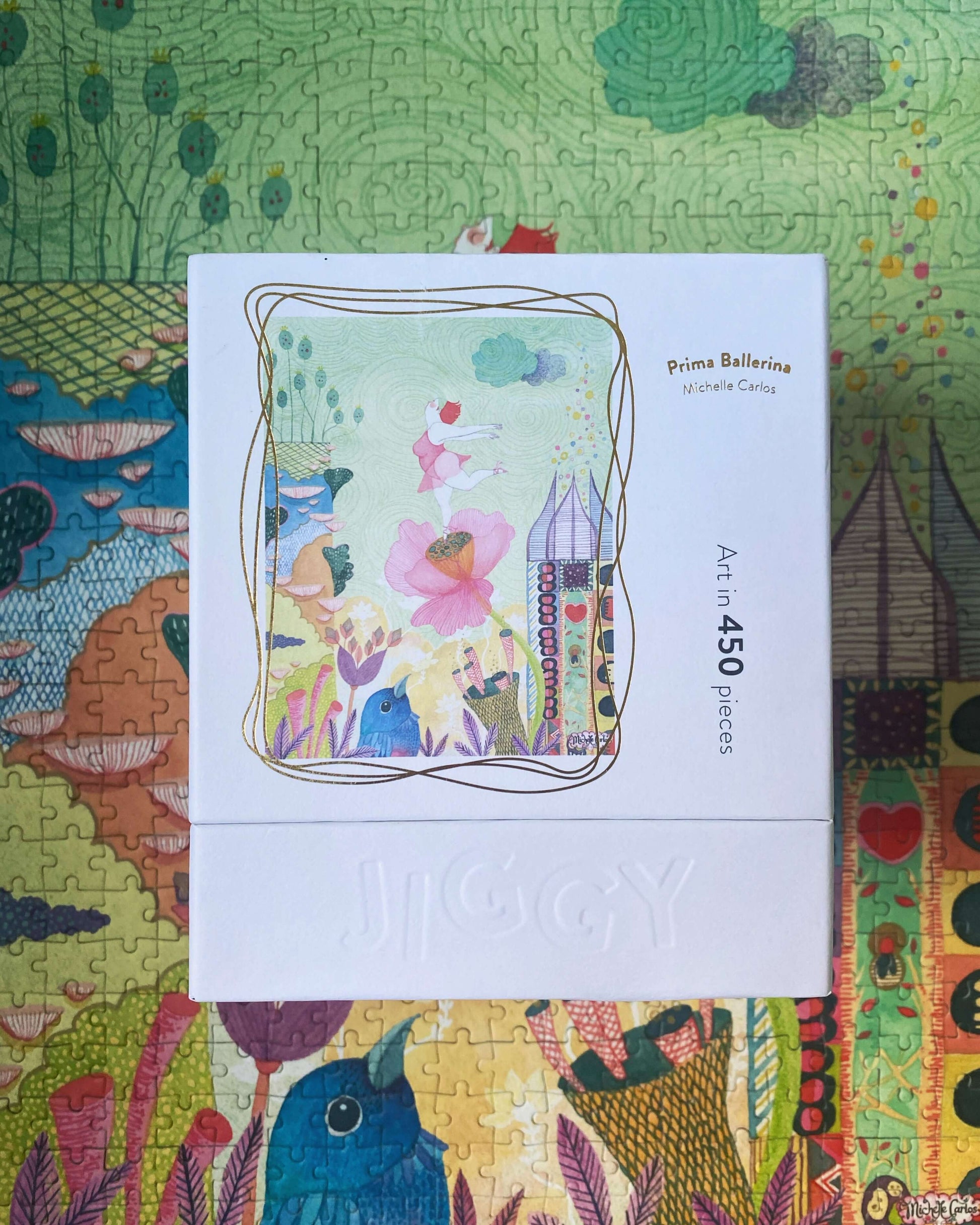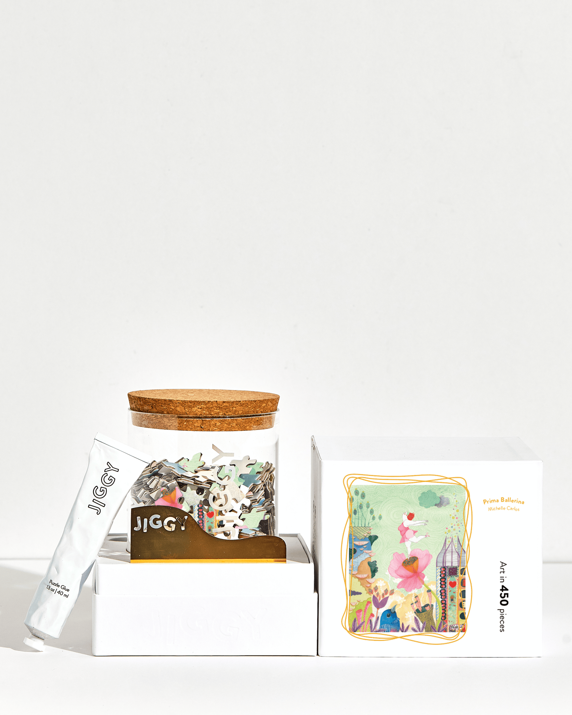 Each JIGGY puzzle comes in a reusable glass jar and includes a tube of puzzle glue, a straight-edge tool to spread the glue and a print of the art to follow.