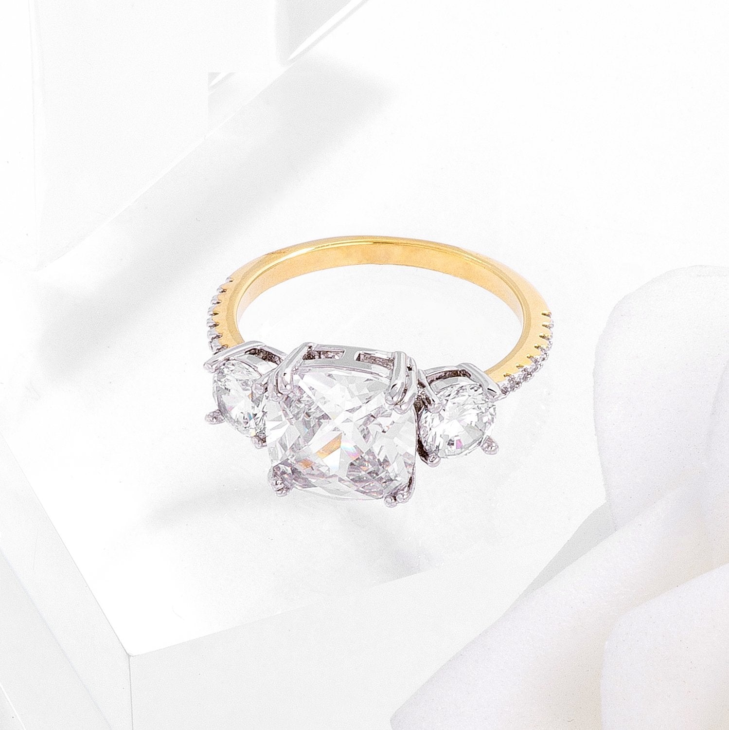 Discover timeless elegance with The Modern Royal Classic, a stunning engagement ring that marries contemporary design with traditional sophistication. This piece showcases a magnificent 2.75-carat checkered cushion-cut center stone, complemented by brilliant round accent stones and intricate micropave CZ detailing along the band. Crafted in 18k gold with rhodium plating for enhanced durability and luster, the ring combines a classic prong setting with refined proportions. Perfect for those seeking a regal yet modern aesthetic, this engagement ring delivers exceptional sparkle and enduring style. Total carat weight: 3.65Ct.