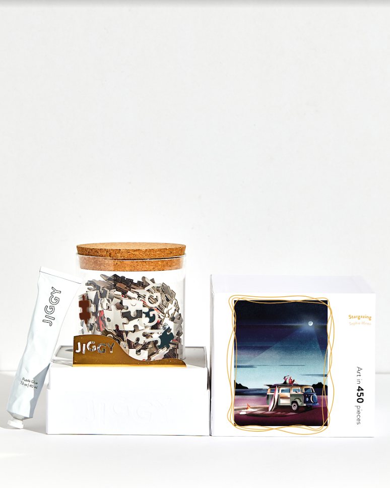 Each JIGGY puzzle comes in a reusable glass jar and includes a tube of puzzle glue, a straight-edge tool to spread the glue and a print of the art to follow.