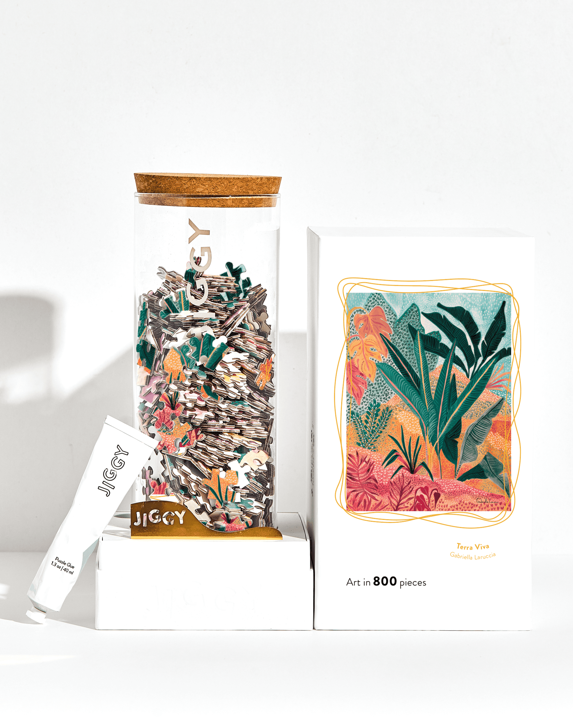 Each JIGGY puzzle comes in a reusable glass jar and includes a tube of puzzle glue, a straight-edge tool to spread the glue and a print of the art to follow.